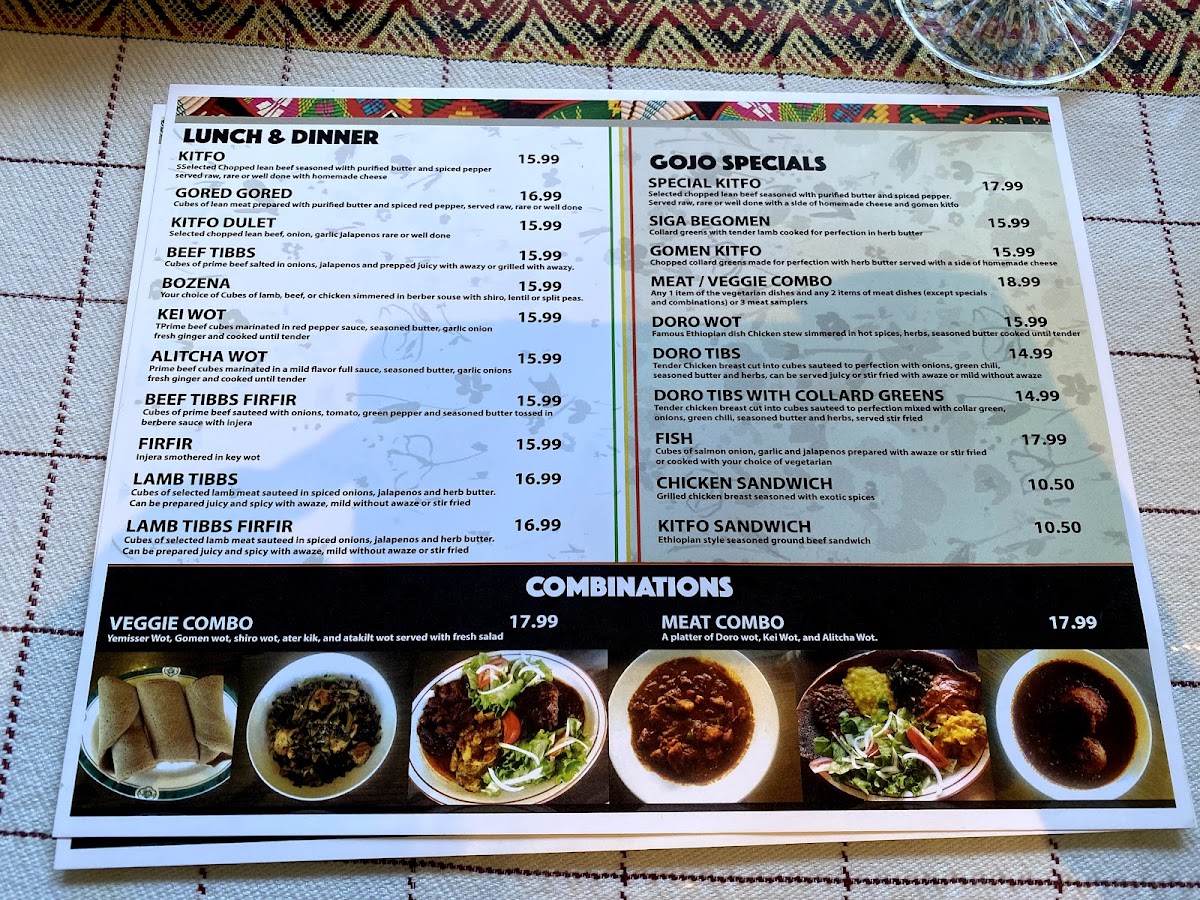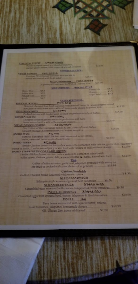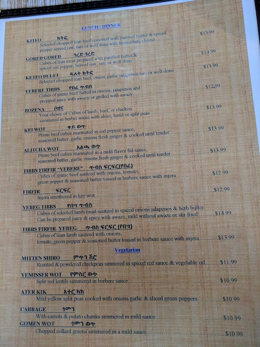 Cubes of lean lamb sautéed with onions, tomato, green pepper and seasoned butter tossed in berbere sauce with injera.