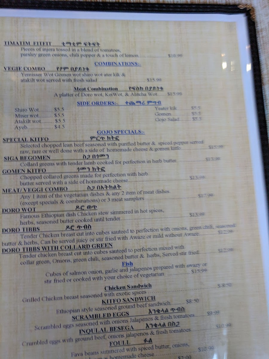 Selected chopped lean beef seasoned with purified butter and spiced pepper served raw, rare or well done with a side of homemade cheese and gomen kitfo.